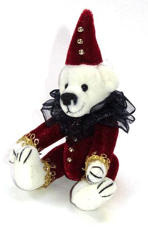 | Beppo Der Clown ist ca. 10cm groß. Sein Fell ist aus Minimohair in Weiß und Weinrot mit goldfarbener Spitze und Perlen. 42,-€ |