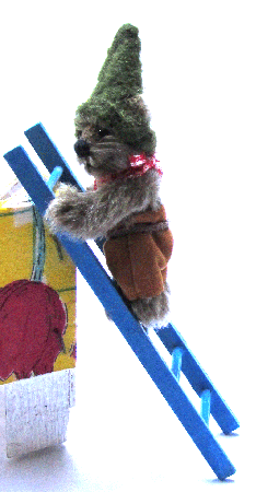 | GrimmbärtEr ist ca. 12 cm groß und sitzt vor einem Baumstamm mit Pilzen. Seine Bekleidung ist aus Filz die mit Lederbändern geschnürt wurde. Die Laterne die er trägt ist ca. 40 Jahre alt. 48,-€ |