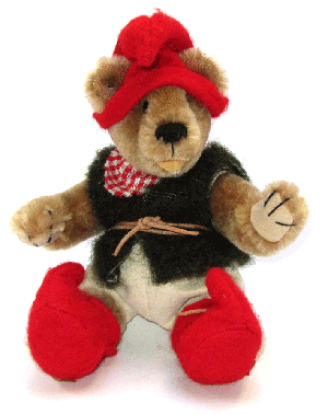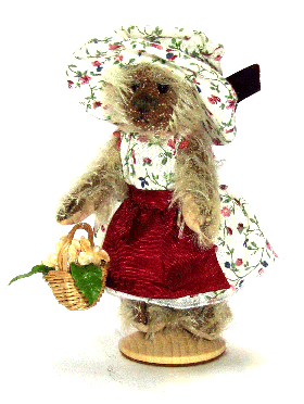 | Daisy Das Bärenmädchen ist ca. 12cm groß. Ihr Fell ist aus Sparse -Mohair. Sie hält ein Körbchen mit Blumen und trägt ein niedliches Blumenkleid mit roter Schürze und Unterhose, sowie einen passenden Blumenhut. 38,-€ |