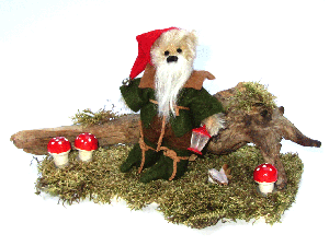 | Zwerg Der Pilz auf dem der Bär sitz ist gefilzt. Der Bär ist ca. 8cm groß und trägt eine Jacke aus Wildlederimitat und Holzperlen. An seinem aufwendig gefertigten Gürtel hängt ein kleiner Beutel und seine Mütze ist mit einem Glöckchen verziert 38,-€ |