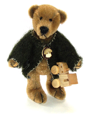 Der Bär ist ca. 13cm groß. Sein Fell ist aus Longpile und wurde mit Glasgranulat für mehr Gwicht und Standfestigkeit gefüllt. Seine Jacke ist aus Walkloden und er hält eine kleine Spielzeuglok aus Holz. Verkauft |