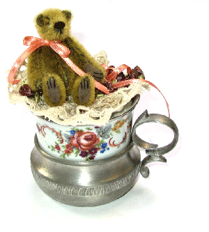 | Tassimo It`s Coffeetime, Der kleine Bär ist ca. 6cm groß. Sein Fell ist aus Smokey Long pile. Er sitz auf einer Mokka Porzelantasse mit Zinnhalter und Spitzenkissen. 35,-€ |