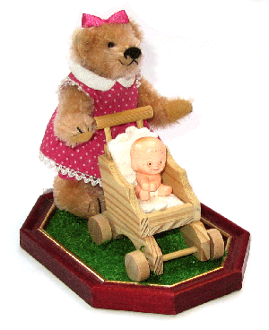 | Lisa-Marie Die kleine Bärendame ist ca. 10 cm groß. Sie trägt ein süsses rosa Kleidchen und ein passendes Schleifchen im Haar. Im Puppenwagen aus Holz fährt sie ein Baby mit Spitzenkissen spazieren. 38,-€ |
